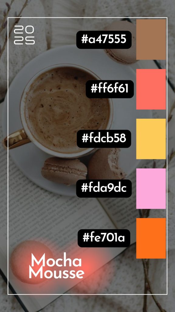 1.-Aplicaciones en diseño del color mocha mousse: La elección del color mocha mousse por parte de Pantone, no estuve exenta de polémica, puesto que, al principio, no sorprendió como pasa con otras elecciones. En cambio, poco a poco e investigando más sobre él, su versatilidad, lo convierte en una joya para diseño gráfico, moda, decoración y branding.