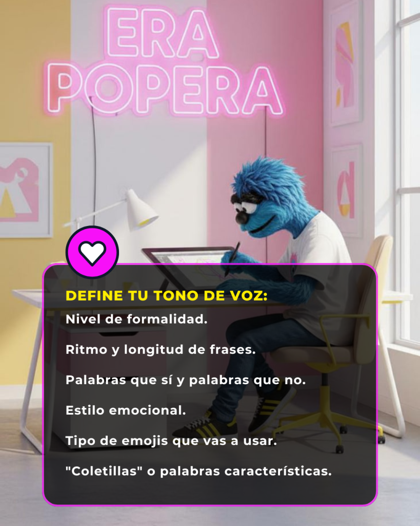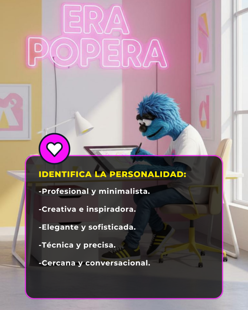 🩷 Consejo Popero: convierte estas respuestas en una brújula creativa. Ejemplo: «Somos una marca cercana y optimista que inspira a las personas a crear sin miedo.»