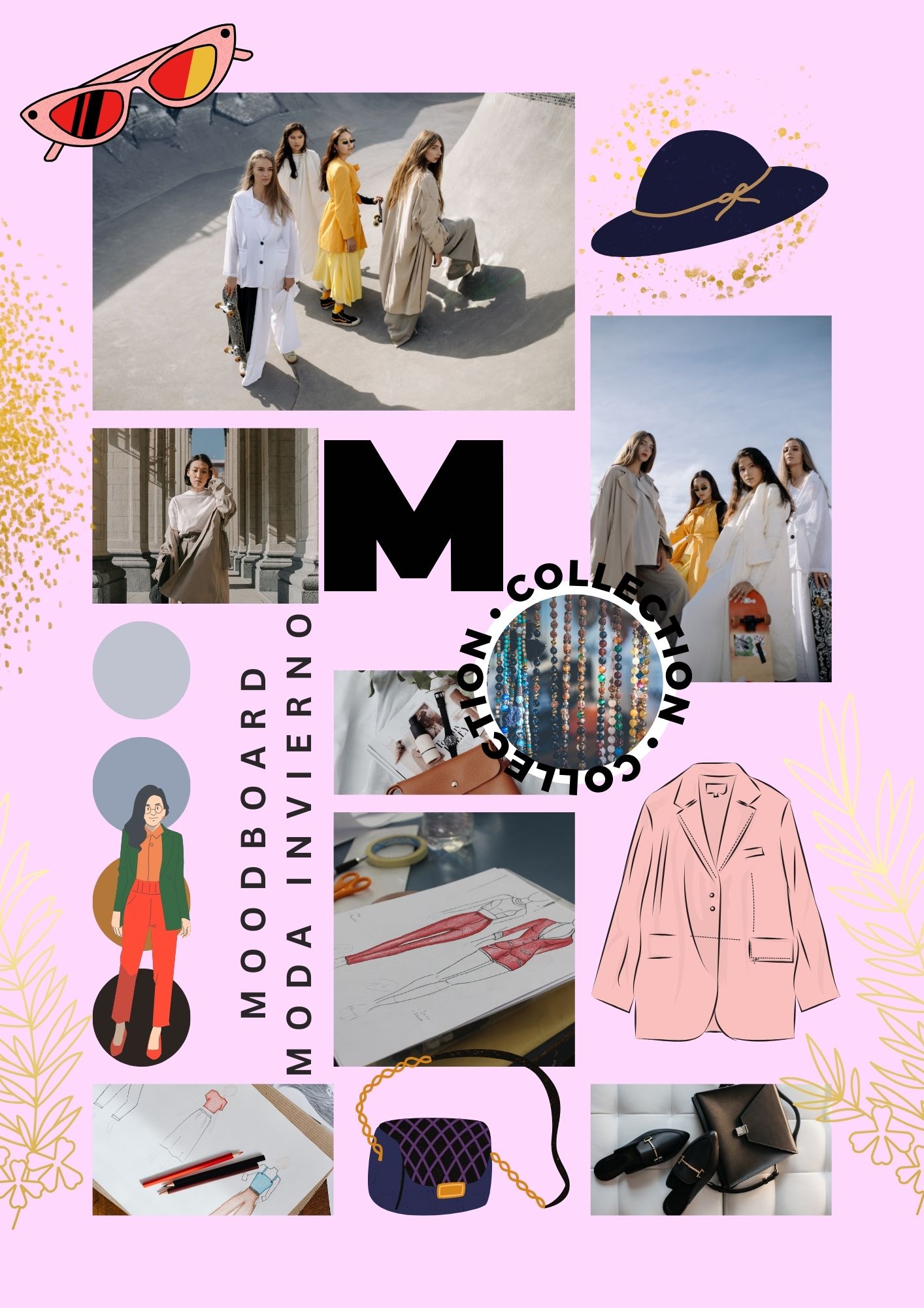 Para crear un moodboard de moda incluye paletas de colores, fotografías, proceso de elaboración, recursos gráficos, tipografías que te inspirar, pinceladas, patrones y muestra tu estilo y conocimientos en este sector.