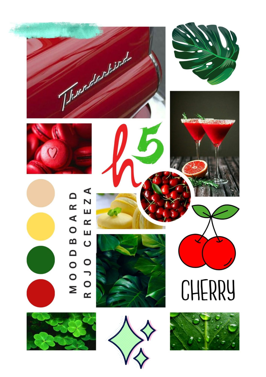 Un moodboard en el que muestras distintas ideas o tu inspiración para una tendencia en concreto. Fotografías, recursos gráficos, paletas de colores, tipo de tipografía que te inspira… Por ejemplo, en Pinterest, el color para el 2025, será el rojo cereza. Hemos creado un ejemplo de moodboard con esta tendencia, el rojo cereza.